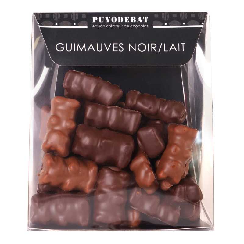 Oursons guimauves enrobés de chocolat au lait et chocolat noir.